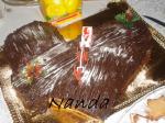 Grazi, tanto no recheio como na cobertura inventei e não me dei muito mal. Fiz o seguinte para o recheio foi tabulete de chocolate de leite c/ amêndoas e meia tabulete de chocolate preto amargo que se usa na mousse de chocolate, foi ao lume muito baixinho e em em banho maria, coloquei lá dentro os chocolates , um pouquinho de margarina ou manteiga e um pacote de 200ml de natas ( eu sei que no brasil se dá outro nome a isto mas eu juro que não me lembro, me deu uma branca completa) deixei derretertudo muito bem e depois foi só barrar a torta. Para a cobertura a formula foi a mesma o que mudou foi o chcolate de leite foi o mesmo mas sem as amêndoas, oresto é tudo igual, no final depois de ter coberto a torta e deuixado esfriar é que meti o açúcar em pó, ou melhor foi açúcar cristal, só que moído napicadora para ficar bem fininho. Et.....................voilá .................saíu esta delícia.