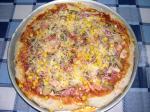uma massa de pão fresca(compro em qualquer padaria, hipermercado) molho base para pizza queijo e fiambre fatiado milho, cogumelos e bacon em cubinhos queijo ralado